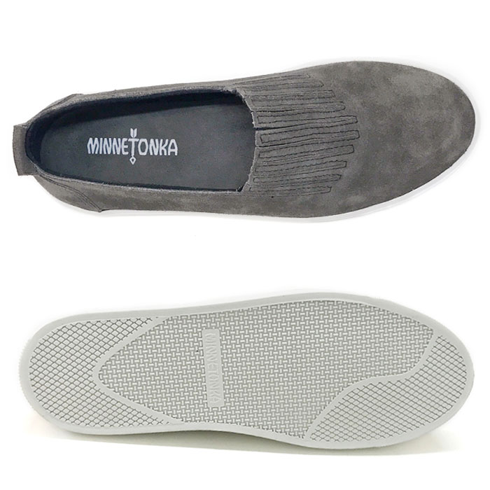 送料無料!! ミネトンカからテニスシューズにインスパイアされたスニーカースリッポンが新登場! 甲の部分のステッチが程良いアクセントになり伸縮自在のゴア素材が合わさって更に履きやすくなったスリッポンはベーシックなスエードアッパーが大人カジュアルに良く合います。