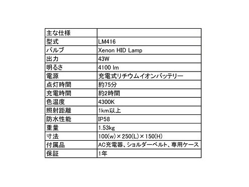【仕様】 ●バルブ:Xenon HID Lamp ●出力:43W ●明るさ:4100lm ●電源:充電式リチウムイオンバッテリー ●点灯時間:約75分 ●充電時間:約2時間 ●色温度:4300K ●照射距離:1km以上 ●防水性能:IP58 ●重量:1.53kg ●寸法(mm):100WX250LX150H ●付属品:AC充電器、ショルダーベルト、専用ケース